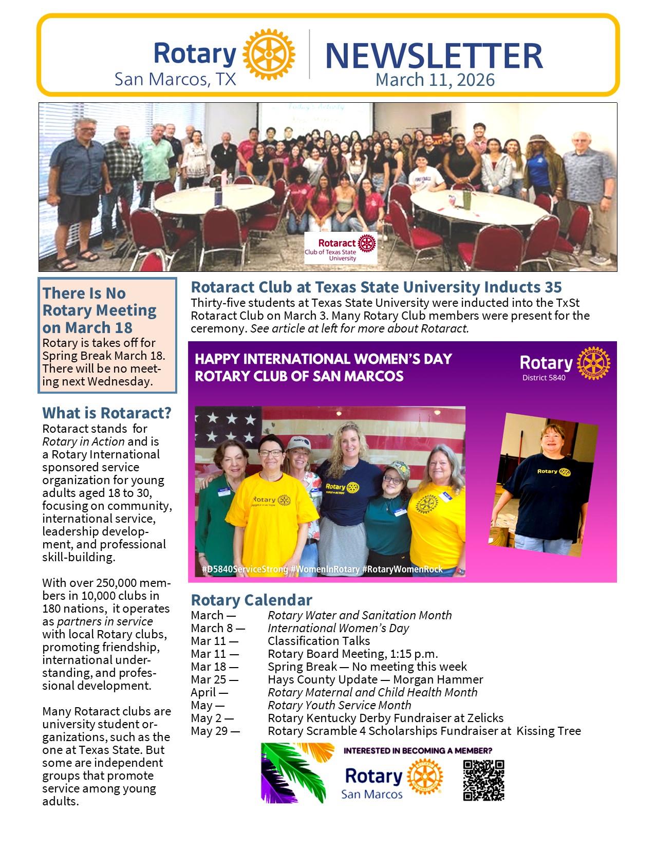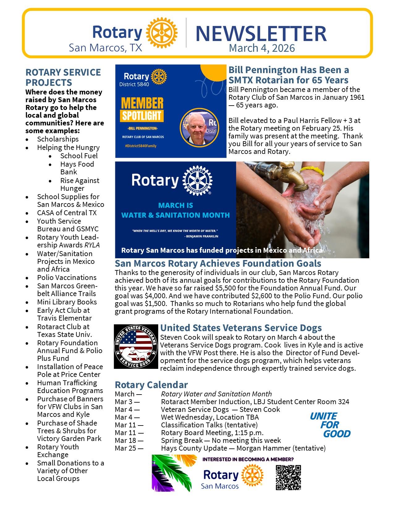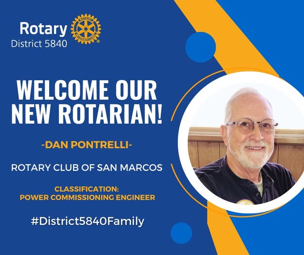 Frank brings to the Rotary Club of San Marcos a lot of Rotary and life experience. He hopes that San Marcos can be involved in an international water project while he is President. He believes those projects have a real impact on the day-to-day lives of people.